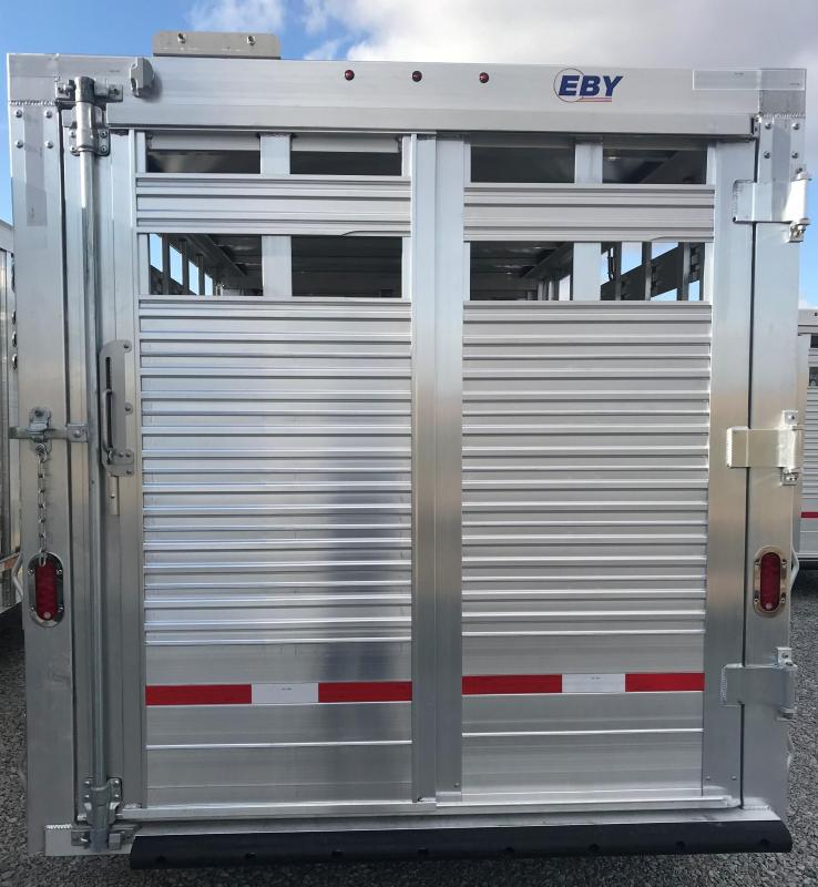 A close-up view of a silver metal trailer with the word 'EBY' written on the top. The trailer has a metal door with a handle on the left side and a latch on the right side. The door is closed, and the trailer is parked on a gravel surface. | 2020 Eby 30' x 6'6'' Mav Tri Slat B 52cs AL Wheels (Located in TX) | 3e6074ba0d02aeff622618f2f9be602aa7d0e164cdfb3bb0e6be66e45fd28622 | 000720977250 | 0 | 0 | 49 | 15 | 0 | 0 | |