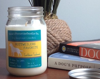 A glass jar with a label that reads 'Rottweilers Favorite Candle Co.' sits on a wooden surface next to a stack of books. The jar has a yellow label with a picture of a Rottweiler and the words 'Rottweilers Favorite Candle Co.' in blue. The books are titled 'A Dog's Purpose' and 'Shelter Me'. There is a potted plant wit... | Scented Candle, Caribbean Teakwood Soy Candle, Dog Lover Gift, Gift for Her, Gift for Him, Rottweilers Favorite Soy Candle 16oz Mason Jar | 08ff55497d3ef708244112c85e149d5a8c4bd81c10afe3a2e1b7788442a16647 | 000720977299 | 0 | 0 | 65 | 22 | 0 | 0 | |