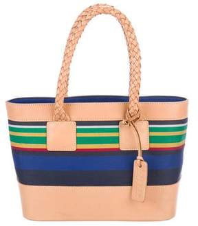 A beige canvas tote bag with a brown leather handle and a metal zipper closure. The bag features a colorful striped pattern on the bottom and sides, with a blue, yellow, and green color scheme. There is a small metal tag attached to the bottom right corner of the bag. | Ralph Lauren Ralph Leather-Trimmed Striped Tote | 993e55bba86967c5845c7536ea0687f5a4b05e2f5528bcf176614ebb03b98f4a | 000720977272 | 0 | 0 | 50 | 6 | 0 | 0 | |