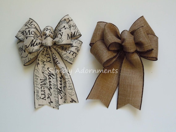 Two bows are displayed against a white background. The left bow is a light brown color with a white ribbon and features a monogrammed design with the letters 'M' and 'M' intertwined. The right bow is a darker brown color with a brown ribbon and has a simple bow shape without any monogramming. | Rustic Burlap Ivory Christmas Bow Vintage Merry Christmas Scripts Bow Christmas Wreath Swag Bow Christmas Gifts Bow Vintage Rustic door bow | 385d4c78e3cc734bb3f984dd2ff91edce12fe5928542847c312723854e2117b9 | 000720977439 | 0 | 0 | 53 | 21 | 0 | 0 | |
