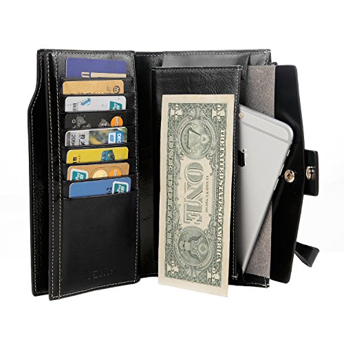 A black leather wallet is open, displaying various cards and a $1 bill. The cards include a mix of credit cards, debit cards, and loyalty cards, with some cards having visible logos such as Visa, Mastercard, and American Express. The wallet also contains a smartphone and a pen. | S ZONE Womens RFID Blocking Genuine Leather Clutch Wallet | 31533cec9ed3e5ee5ad0f9fafeb9ca9ace75294fe09d4104ac4cb5e3969f8024 | 000720977478 | 0 | 0 | 48 | 9 | 0 | 0 | |