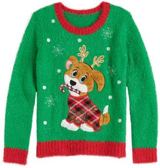 A festive holiday sweater with a cartoon dog design on the front. The sweater is green with a red collar and cuffs, and features a red and white plaid pattern on the dog's body. The dog has a red bow tie and is holding a candy cane. There are white snowflakes scattered across the sweater, and the dog's eyes are a brigh... | It's Our Time Its Our Time Girl's 7-16 Plus Size Christmas Puppy With Antlers Pullover Sweater | 7c95b1b1dd9e3e7d4b6c219d3affd492ef4a8e8da985fb2581968d931498d9d6 | 000720977091 | 0 | 0 | 63 | 16 | 0 | 0 | |