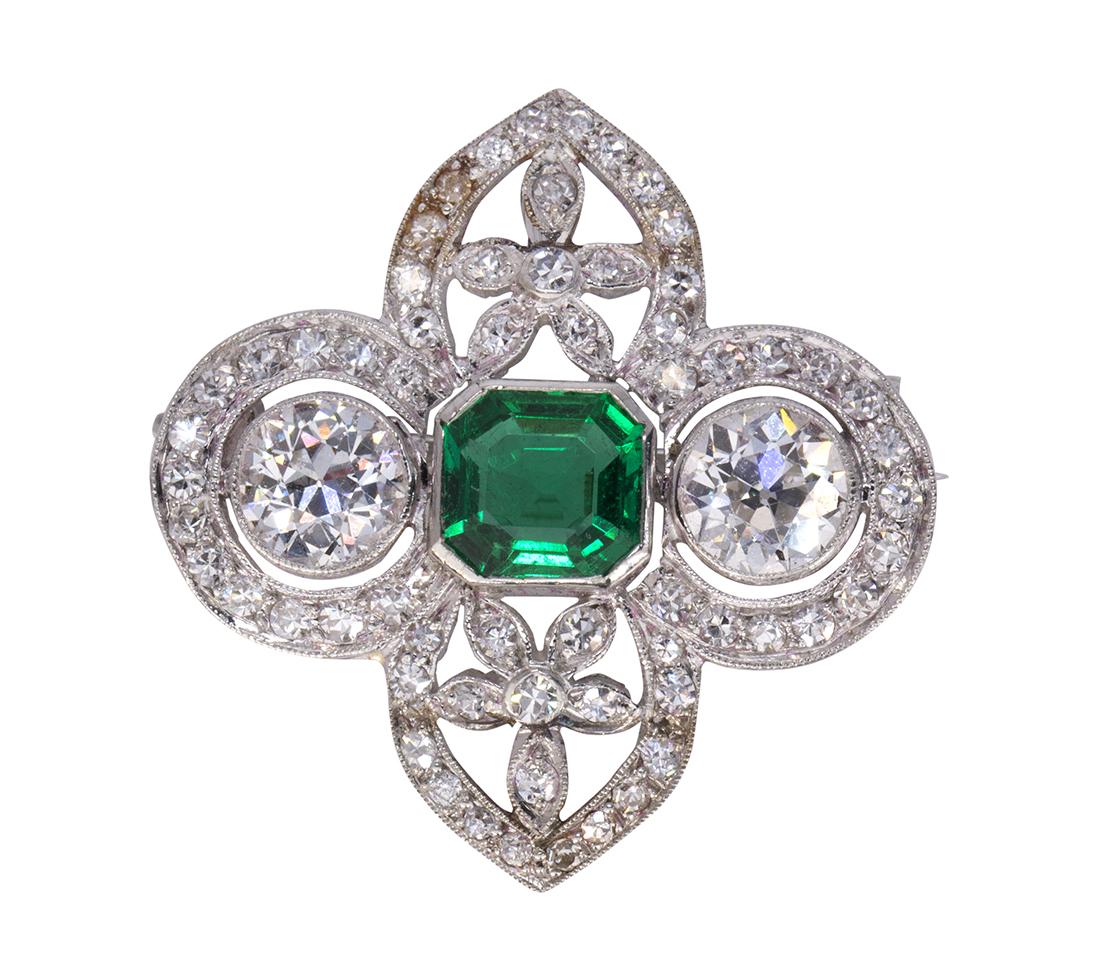 A close-up image of a large, ornate, multi-faceted emerald surrounded by a halo of smaller emeralds and a multitude of diamonds. The emerald is set within a detailed silver brooch featuring intricate Celtic knotwork and is mounted on a white background. | Edwardian emerald, diamond and platinum brooch | 7a39c469b1e61d661c5fbfb1d35b0279f1f45cfc09d687c7869596e66cddf2df | 000720977533 | 0 | 0 | 41 | 6 | 0 | 0 | |