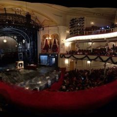 A theater stage with a red curtain partially drawn, revealing a wooden stage floor. The stage is adorned with a large, ornate clock on the left side and a decorative archway with red and gold elements. The audience is seated in the balcony level, which is lined with golden railings. The theater has a grand, opulent des... | Ford's Theatre User Photo | 6271772b048a8a602b0cf603726844033f4e63bbe57f8eb089bbc2725ff9d5f4 | 000720977810 | 0 | 0 | 76 | 4 | 0 | 0 | |