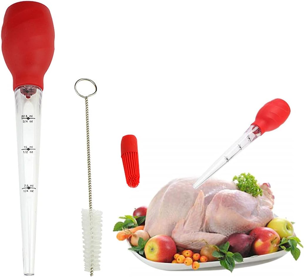 A red kitchen utensil set is displayed on a white background. The set includes a red measuring cup with a red handle, a red whisk, a red spatula, and a red meat thermometer. The measuring cup has a red lid and a red base with a black scale on the side. The whisk has a red handle and a red head with bristles. The spatul... | DKE&YMQ Meat Injector Syringe, Food-Grade Turkey Injector, Including Silicone Barbecue Brush and Cleaning Brush, Suitable for Adding Seasoning Herbs, Barbecue Syringe, and Marinating | 6978e55e6ef7195dcab4525a79094b5674df2baf54380320c30d72386ba9eae6 | 000720977777 | 0 | 0 | 84 | 23 | 0 | 0 | |