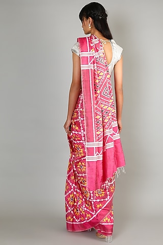 A woman is wearing a pink and white traditional Indian saree with intricate patterns and a matching blouse. | Blush Pink Single Weft Ikat Mulberry Silk Saree Set by Abir Pal | 0a3ae0e3ddff4ae543515cc4e0d37552f9773de7e52943845559b177a16e7296 | 000720977497 | 0 | 0 | 18 | 12 | 0 | 0 | |