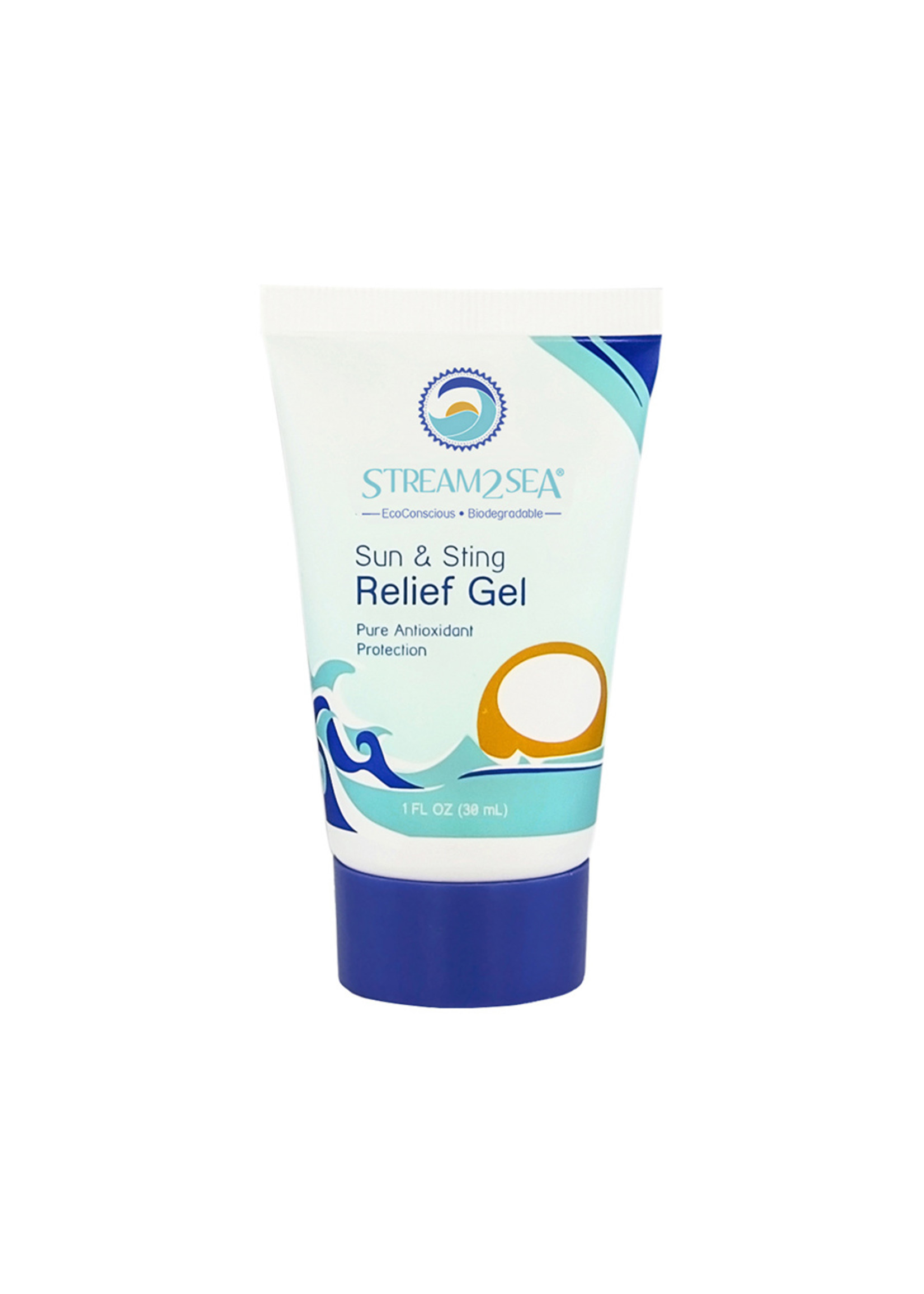 A tube of Streamase Sun & Sting Relief Gel is displayed against a white background. The gel is in a blue and white tube with a blue cap, and the label features a wave design with the brand name 'Streamase' and the phrase 'Sun & Sting Relief Gel'. The gel is described as providing 'Protection from sunburn, insect bites,... | Stream2Sea Stream2Sea Sun & Sting Relief Gel 1oz / 30ml | aafacafabc9309315270501474599b68114f1c04f35c261d8ed7ed1de24d4a12 | 000720979368 | 0 | 0 | 64 | 10 | 0 | 0 | |
