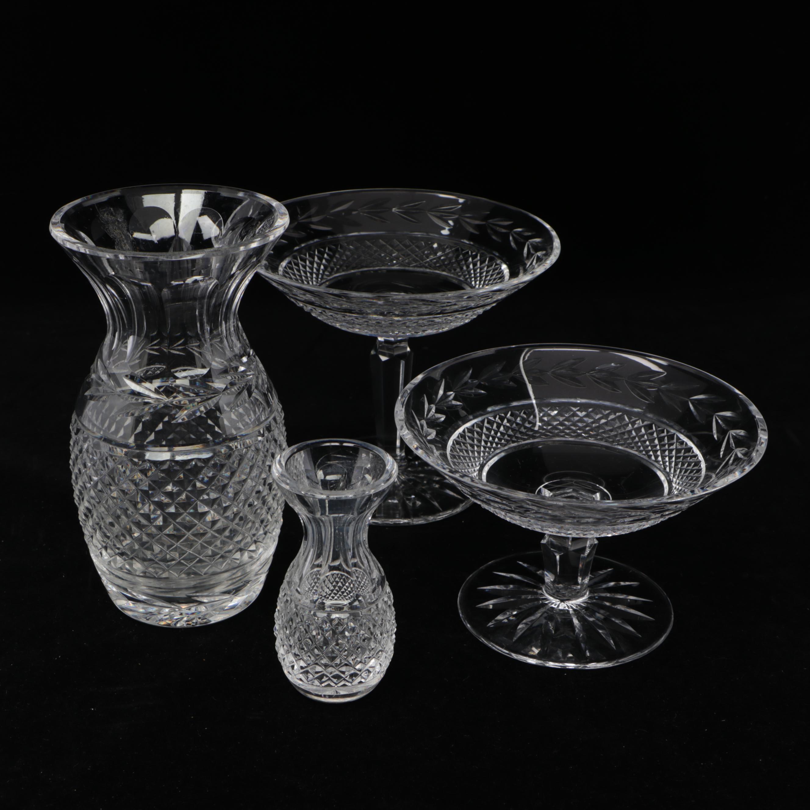 A set of crystal glassware is displayed on a black background. The set includes a tall vase, a smaller vase, a wine glass, and a bowl. The glassware has intricate designs and is clear, allowing the light to reflect off its surfaces. | Waterford Crystal "Glandore" Vase and Dish Set | 16c5b24be83f9fe2ffe5ae8873045062bcf0db297db4e7c3466f79d481942562 | 000720979484 | 0 | 0 | 42 | 7 | 0 | 0 | |