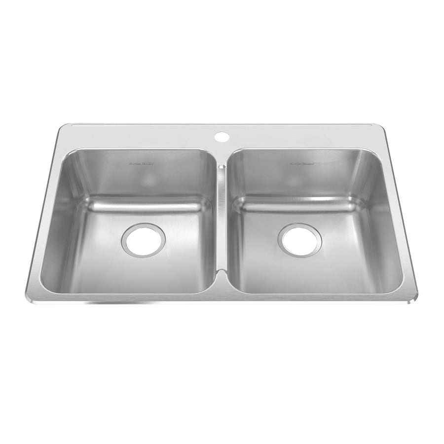A sleek, modern stainless steel double sink with a single faucet, set against a white background. | American Standard Prevoir 37.75-in x 25.3125-in Radiant Silk Double-Basin Drop-In Kitchen Sink | 5596484b456018cc9e488e0ed02d62bfd4bcf1783cea92193483f54efec3839a | 000720979302 | 0 | 0 | 16 | 12 | 0 | 0 |
