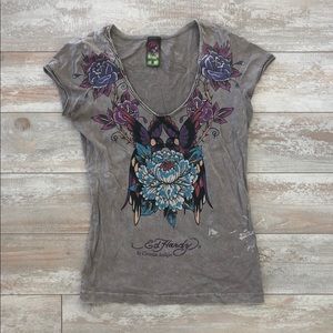 A grey t-shirt with a floral design on the front is displayed against a wooden background. The t-shirt has a round neckline and a tag attached to the top left side. The floral design features a large central flower with smaller flowers and leaves surrounding it, all in shades of purple, pink, and blue. The t-shirt also... | Ed Hardy T-shirt | b19b8a178993f277c1345bbef022f6616603d35452325034b105183cc33dd9af | 000720979786 | 0 | 0 | 67 | 3 | 0 | 0 | |