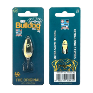 Two fishing lures are displayed in their original packaging. The lures are designed to look like a bulldog's head and are labeled 'OGP Bulldog'. The packaging is blue with a white label featuring the bulldog logo and the words 'The Original!' and 'OG LURE.COM'. Each lure has a unique barcode and is packaged in a clear ... | Ogp Bulldog 24k Gold 7 Gr - Blink | 4f0fc498cbfa6d5ddef322da1f4728e8cc89415aed15cfb12fa3338b15f04a23 | 000720979713 | 0 | 0 | 58 | 8 | 0 | 0 | |
