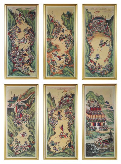 A collection of four framed artworks depicting a battle scene with various figures and elements such as soldiers, horses, and a castle. The artworks are arranged in a vertical row, each framed in a simple gold frame. The top left artwork shows a dense battle scene with many figures and a castle in the background. The t... | A SET OF SIX CHINESE PAINTINGS | 72ef4b8a2ef853fcfce9f3bbac7e95ae72597fc89c91c6cd23bdcfd52d6bb162 | 000720979886 | 0 | 0 | 115 | 6 | 0 | 0 | |