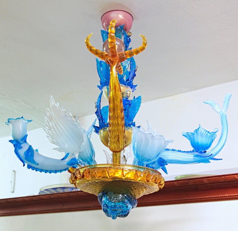 A colorful glass chandelier with intricate designs and a variety of hues hangs from a ceiling. The chandelier features a central golden rod with blue and white glass elements, including fish, leaves, and other decorative shapes. The chandelier is mounted on a wooden shelf with a plate on it. | Pino Signoretto, Last Judgement Hyeronimus Bosch Chandelier For Sale 7 | ebf470aba651f8ec17b23e1621c87e5aa4d427f4480d959b1e4698b6cef35ee6 | 000720980650 | 0 | 0 | 49 | 10 | 0 | 0 | |