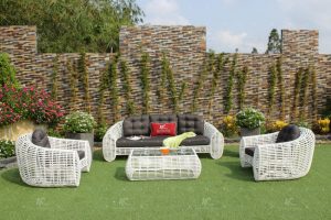 A modern outdoor seating area with a black leather sofa and two white wicker chairs. The sofa has a red cushion on it, and there is a small white table with a glass top and a vase with flowers on it. The chairs have black cushions, and there is a small white table with a glass top and a vase with flowers on it next to ... | Synthetic rattan garden furniture RASF-053 | 93d65ca10b780f85a089c27893f9d34ac508810685b2b7f42a0715c7f8092536 | 000720980515 | 0 | 0 | 94 | 5 | 0 | 0 | |