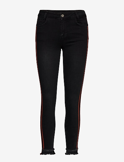 A pair of black jeans with red stripes on the sides is displayed against a white background. | DHSila 7/8 High Custom - slim jeans - black /cinnamon stick tape | 8a8ae7ecd2ea029d856382686ac52231203df59ad86055456d4ec35d5ce5e8b8 | 000720980608 | 0 | 0 | 17 | 12 | 0 | 0 | |