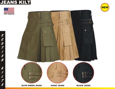 A collection of three different styles of pleated skirts, each with a unique color and design. The skirts are displayed against a white background with a price tag and a 'NEW' label. The first skirt is olive green with a zipper closure and a belt loop, the second is khaki with a zipper closure and a belt loop, and the ... | New Men Scottish Modern Kilt Jeans Cotton with Double Straps and pockets Colors | 9445d54077066afac52511838e8c4fe51615da9af7df38771999e68a5db78ad4 | 000720980692 | 0 | 0 | 71 | 13 | 0 | 0 | |