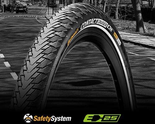 A close-up of a black tire with a white sidewall and the text 'CONTACT CHAMBER' on it. The tire is on a road with a shadow cast on the ground. In the background, there is a street with a car and a pedestrian visible. The image has a safety system logo at the bottom right corner. | flanc Reflex Offre Speciale Continental Pneu City-VTC 700 x 47 Cruise Contact Reflex Noir TR 28-29x1,75 47-622 | ce3e039c411fe5ff887efdbb081d2f507f0589a90dc2eb335717d2b76a07b0c8 | 000720980678 | 0 | 0 | 56 | 17 | 0 | 0 | |