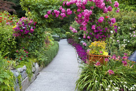 A vibrant garden path is lined with lush greenery and colorful flowers. The path is flanked by tall hedges and a variety of flowering plants, including pink and purple blooms. The garden is well-maintained, with a clear and clean pathway leading through the scene. | Rose Garden at Butchard Gardens in Full Bloom, Victoria, British Columbia, Canada-Terry Eggers-Photographic Print | 504ff8304370aa768d0e880addf2b6a270d39294bfba36700f1c4439dfd68342 | 000720980672 | 0 | 0 | 44 | 14 | 0 | 0 | |