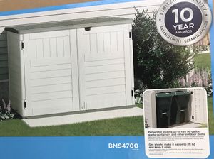 A white shed with a blue sticker on the front that reads '10 Year Warranty' and 'Lifetime Guarantee'. The shed has a closed door with two windows and a small window on the top. There is a green bush to the right of the shed and a grassy area in front. A black trash can is placed to the right of the shed. | Stow Away Horizontal Shed by Suncast Brand New in Box for Sale in Lauderhill, FL | ce0a9436064d33c7ba3766d3a15efbac349f1f5de2d002633bc765a1c69c82bf | 000720980675 | 0 | 0 | 63 | 15 | 0 | 0 | |
