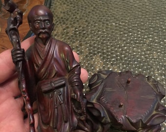 A hand holding a small, detailed figurine of an elderly man with a long beard, wearing traditional robes, and holding a staff. The figurine is made of a dark, polished material, possibly wood or metal, and is placed on a surface with a reflective background. | Antique Chinese Carved Hardwood Luohan Figurine | 6d85dc9170bcefea148c64587da181645298c245e91e55c4d7007a92746b0602 | 000720980785 | 0 | 0 | 45 | 6 | 0 | 0 | |