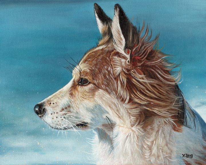 A watercolor painting of a dog with a white and brown coat, featuring a detailed depiction of the dog's fur texture and the softness of the watercolor medium. The background is a textured blue sky with white specks, giving the impression of a cloudy day. | Oil painting - Corgi profile - Yue Zeng | dc8606ee965017b67ea3ea7b5fcc75ca1974f0b50c379c402d55b5da28214fc5 | 000720980747 | 0 | 0 | 45 | 8 | 0 | 0 | |