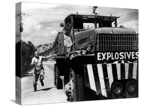A black and white image depicting a man running on a dirt road towards a large, vintage military truck. The truck has a cage-like structure on the back and is labeled 'EXPLOSIVES'. The man is wearing a sleeveless shirt and shorts, and the scene has a grainy, aged appearance. | The Wages Of Fear, (aka Le Salaire De La Peur), Charles Vanel, Yves Montand, 1953 Photo | 24d65fc18b8172fb5dbd39ff8e560a73ac08250b53872d2ddd994723ce7682ab | 000720980819 | 0 | 0 | 49 | 16 | 0 | 0 | |