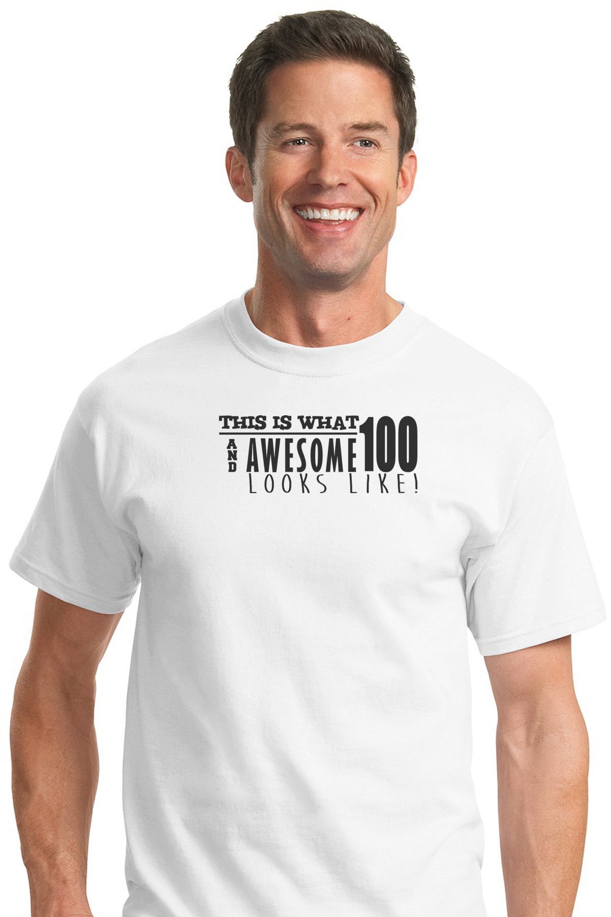 A man is wearing a white t-shirt with the phrase 'This is what awesome looks like' in black text. | This Is What 100 And Awesome Looks Like 100th Birthday T Shirt | 3a775844a975ebba4d6bdf661a5d87120ddbfd873ef797ff273c2dc9ea87b788 | 000720980805 | 0 | 0 | 19 | 12 | 0 | 0 | |