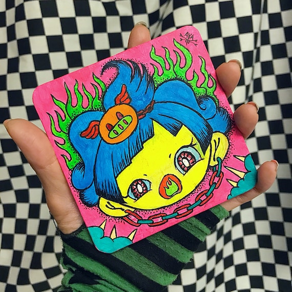 A person is holding a small, square, pink coaster with a colorful illustration of a cartoon character with blue hair, red eyes, and a green mouth. The character is wearing a red bow and has a red and yellow hat on its head. The background of the coaster features a checkered pattern with green and white squares. | mini drawing punk art original drawing kawaii drawing Kawaii punk girl Aya Masuda kawaii | 43b8f8ecf72779d63b0b507b3478f86b6561f83fec8c6090e89bbf26feaeb38f | 000720981076 | 0 | 0 | 57 | 14 | 0 | 0 | |