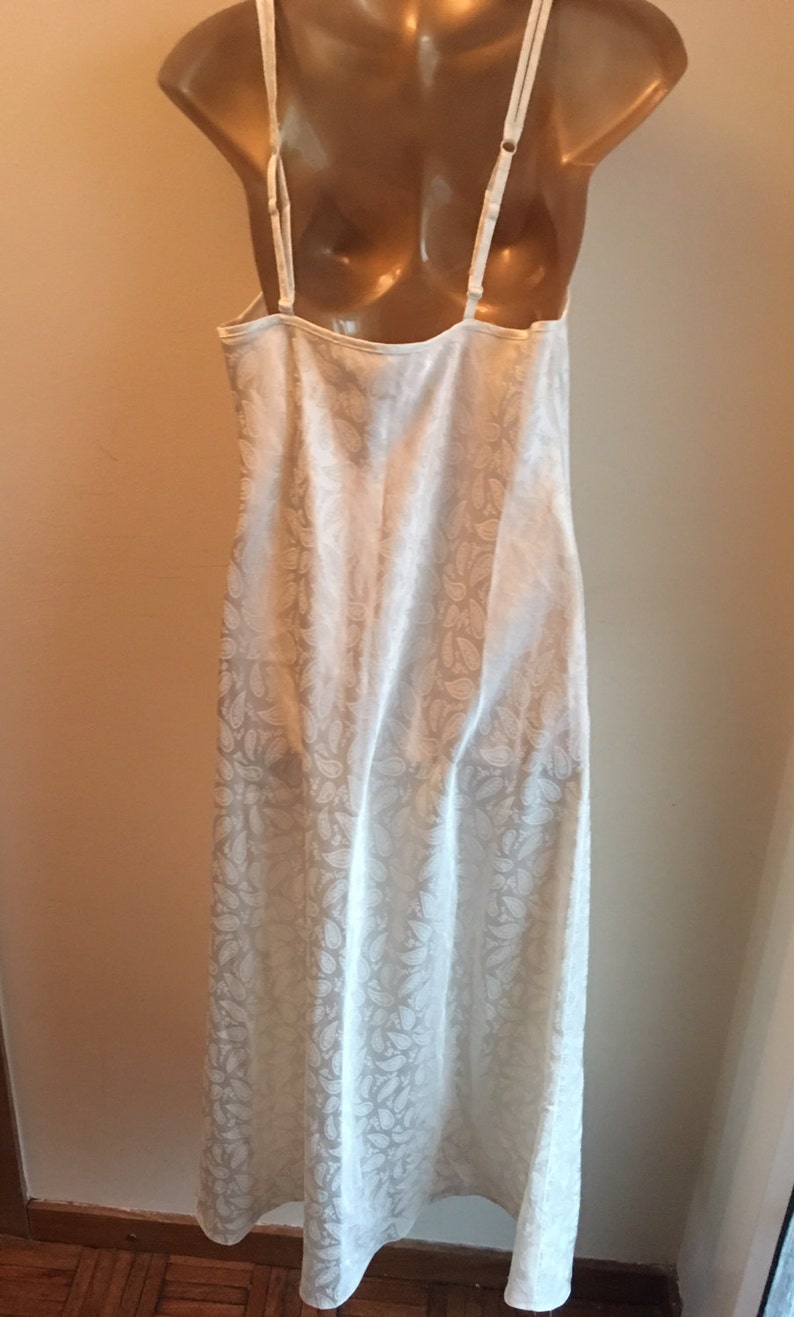 A mannequin wearing a white dress with a floral pattern is displayed against a plain white wall. The dress has thin straps and a fitted bodice with a flared skirt. The mannequin is positioned on a wooden floor, and the lighting casts a soft shadow to the right of the mannequin. | Vintage cream paisley print full length night dress with embroidered floral decoration size 10 | 2de5895a5cf78f05ae28d561b8888a7842671e65a3405fd62f0a6c9d3a716447 | 000720981352 | 0 | 0 | 51 | 14 | 0 | 0 | |