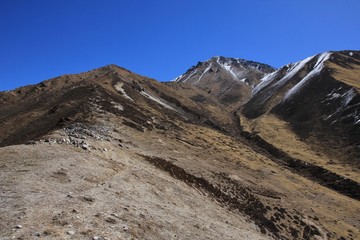 A barren mountain landscape with a clear blue sky above. The terrain is covered with dry, brown grass and sparse vegetation. The mountain slopes are steep and rugged, with some patches of snow visible on the higher elevations. | Path leading to the top of mount Tserko Ri, Langtang National Park, Nepal. Popular viewpoint. | f9ff2168d2721e761be621fbcbca6a4e053ea6c28549f58186e294173a008ade | 000720981481 | 0 | 0 | 38 | 15 | 0 | 0 | |