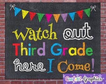 A colorful chalkboard sign with a black background and white chalk lettering. The sign reads 'WATCH OUT 3RD GRADE I COME HERE!' with the words 'WATCH OUT' in yellow, '3RD' in red, 'GRADE' in blue, and 'I COME HERE!' in green. Above the sign, there are colorful triangular bunting flags strung across the top. The sign is... | Watch Out Third Grade Here I Come 3 rd First Day of School First Grade Graduation Grad End of Year Chalkboard Chalk Photo Prop Sign | 89fd279500b5edd23e4096aefadf134c360e23c1e7f2451ccb0ef1cdbd0a4df0 | 000720981950 | 0 | 0 | 76 | 25 | 0 | 0 | |