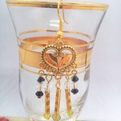 A golden heart-shaped earring with intricate designs and a dangling chain is displayed in a glass vase filled with water. | Gold Plated Chandelier Earrings made with Black Clear and Green Crystals and Gold Plated Tube Beads, Gift for Her 7 | 93434580b5f1a1691c07c7c346dae564b0e6f1d9a792a618c88c1845e0a5ade3 | 000720982102 | 0 | 0 | 20 | 20 | 0 | 0 | |