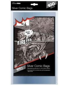 A comic book bag with a graphic of a man in a red shirt and a speech bubble saying 'FIRE!' on the front. The bag is designed to protect comic books and is part of a collection of 100 bags. The packaging is black with a silver comic book logo and the words 'LILIPRO' and 'SILVER COMIC BAGS' in white. | Ultra Pro Silver Size Comic Bags (100) | 064bb24d23b2b4ceeb9f2e79eeff0cf6a6dd30793a8ad30bccfe4a424b94c12e | 000720981907 | 0 | 0 | 60 | 7 | 0 | 0 | |