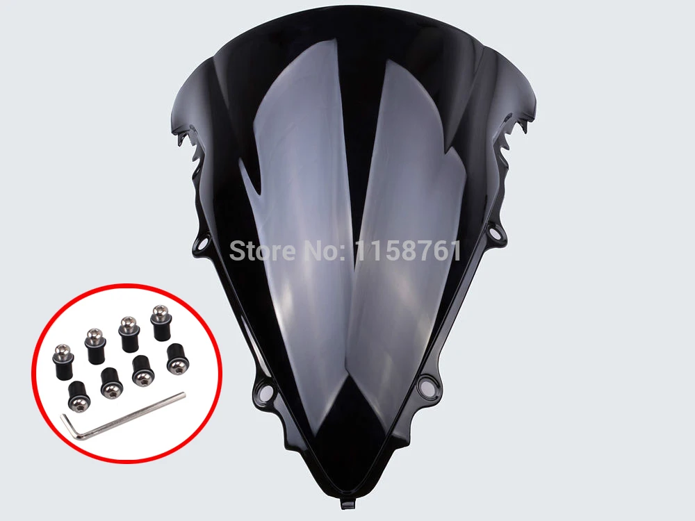 A black motorcycle fairing with a glossy finish is displayed against a white background. Below the fairing, there is a red circle with a white border, and inside the circle, there are nine black bolts and a wrench. The bolts are arranged in two rows of four and one row of one, with the wrench placed to the left of the ... | Windshield Windscreen For Yamaha YZF-R6 2003-2005 //R6S 2006-2009 Black | 2f639f1fddaae09cc0d6d254a5d52b5df64a957b9ae095d6e91c50a65d956792 | 000720982441 | 0 | 0 | 81 | 9 | 0 | 0 |