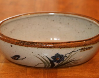 A ceramic bowl with a textured surface and a blue floral design sits on a wooden table. | Vintage Xochiquetzal Mexican Pottery - Tonala Jalisco Mexico - Small Oval Bowl | 63edd27d979d282b5bf4d82a3d2f1d498db2b9497989919d4388e4bf379dd267 | 000720982965 | 0 | 0 | 17 | 12 | 0 | 0 | |