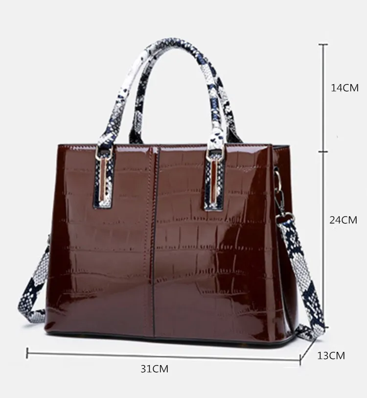 A brown leather handbag with a snake skin pattern is displayed against a white background. The handbag has a structured design with a top handle and a long shoulder strap. It features a front zip closure and two side pockets with zippers. The dimensions of the handbag are indicated by a ruler, showing a height of 15 cm... | Chinese designer New Modern Woman Designer PU Hand Bags 2 Pieces Organiser hand bag | dbad7588b14bef50804541225a4b0fed58118346cc98ab35cb754a4f16854eff | 000720982824 | 0 | 0 | 64 | 14 | 0 | 0 | |