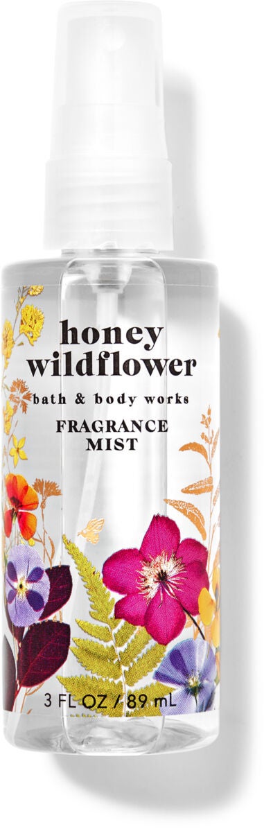 A clear plastic bottle with a white cap, containing a fragrance labeled 'Honey Wildflower Bath & Body Works Fragrance Mist'. The label features a floral design with various flowers and green leaves in shades of pink, purple, yellow, and green. The bottle is placed against a white background. | Honey Wildflower Travel Size Fine Fragrance Mist | 86924332c31ca7836b43cfa426d8a31785c40518c8415613e0839cc947fda824 | 000720982879 | 0 | 0 | 48 | 7 | 0 | 0 | |