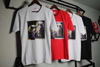 A row of three white t-shirts with black and yellow graphic prints on the front is hanging on a rack. The t-shirts are arranged from left to right, with the first one on the left being the shortest and the third one on the right being the tallest. Each t-shirt has a pink tag on the upper left corner. The rack is mounte... | Supreme tee in 4 colors | e60effe39a41d9ed2dc8ac67792c926b4a9b3e1748f4bbebcd84797e5eee7ea8 | 000720983258 | 0 | 0 | 78 | 5 | 0 | 0 | |