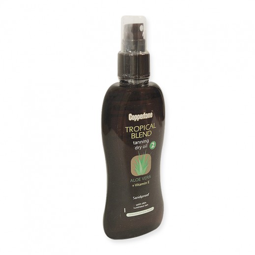 A bottle of tropical blend sunscreen with a green label and a green cap is displayed against a white background. The label features a green leaf design and the words 'TROPICAL BLEND' and 'SUNSCREEN' in white text. The bottle has a pump dispenser on top and is filled with a dark liquid. | Coppertone SPF2 Tropical Tan Dry Oil Spray Aloe Vera 200 ml | 41b738267ab442a15af18b21e42fe5ef1948cf01bfa1db15b4ab7df6d3244a5f | 000720983313 | 0 | 0 | 52 | 11 | 0 | 0 | |