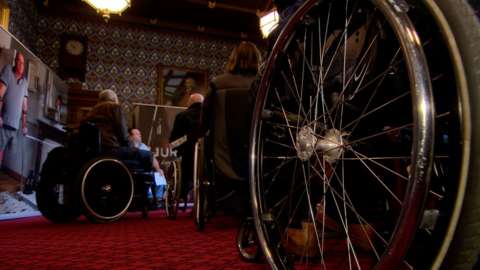 A close-up view of a wheelchair's front wheel, with the surrounding area blurred. The wheel is positioned on a red carpet, and the background features a group of people seated in chairs, with a clock visible on the left side. | Victims of the Troubles in wheelchairs | 2897d68fcee94157eae2826fbc5452e8b0217224007b9819540bd9309004aa46 | 000720983589 | 0 | 0 | 40 | 6 | 0 | 0 | |