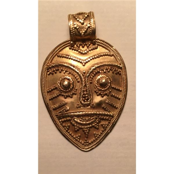 A close-up image of a gold pendant with intricate designs, featuring a central figure with a wide, open mouth and two large, circular eyes. The pendant is set against a white background, highlighting its detailed patterns and textures. | 22KT Gold Viking Filgree Gold Pendant with Norse God Head | 830f9e72d327b899c7290d3f590481f35ecb65ada01743ecd1137a3e4f4618df | 000720983986 | 0 | 0 | 38 | 10 | 0 | 0 | |