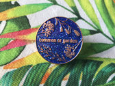 A blue enamel pin with a floral design and the words 'Common of Gardens' is pinned to a tropical print fabric. | Common or Garden enamel badge on card backer photo | bc2b075312c632a201f6c3a57e0d87a87924a9a72e9042661427d6a3657756da | 000720983973 | 0 | 0 | 21 | 9 | 0 | 0 | |