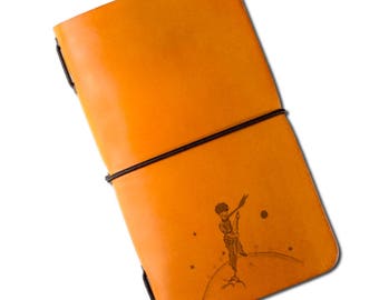 A leather-bound notebook with a cover featuring a hand-drawn image of a person reaching for a planet. The notebook is closed, and the cover is predominantly orange with a brown strap closure. The drawing is in black ink and depicts a person with a long arm reaching towards a planet, with a small moon visible in the bac... | Little Prince engraved notebook with elastic band personalize notebook travel notebook handmade notebook blank pages leather notebook | 51dfd4a0159e9b8232e3f7aa7299d638512d96dfdaf511b47f3699becc16adb1 | 000720983846 | 0 | 0 | 66 | 17 | 0 | 0 | |
