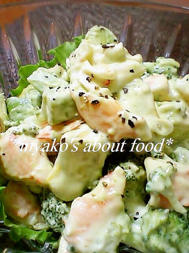 A close-up view of a salad with various ingredients such as lettuce, broccoli, and what appears to be a protein source like chicken or tofu, all mixed together with a creamy sauce. The salad is garnished with black sesame seeds and is presented in a clear glass bowl. The text 'Myayakb's about food' is visible at the bo... | Broccoli, Shrimp and Avocado Salad with Wasabi | 717542ece248ad5ed7e99adf97e17ea2a9259dc2313653458cbcc9c14756bf5b | 000720983841 | 0 | 0 | 61 | 7 | 0 | 0 | |
