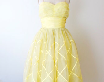 A mannequin is dressed in a yellow strapless dress with a fitted bodice and a flared skirt featuring a lattice pattern. The dress has a high waistline and a zipper at the back. The mannequin is positioned against a plain white background. | RESERVED...1950s Yellow Party Prom Dress | 3f2a2d45e690f4b29bd07db665669f4590b82a3f263258a84aa391f04dafc1eb | 000720984746 | 0 | 0 | 42 | 5 | 0 | 0 | |