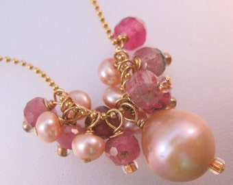 A close-up of a gold necklace with a cluster of pink and white pearls and pink gemstones. The pearls are of various sizes, and the gemstones have a pinkish hue. The necklace is set against a white background, and the lighting highlights the colors and textures of the pearls and gemstones. | Vintage 14k GF Pink Pearl & Tourmaline Pendant Necklace Jewelry Jewellery | 65faf1a479a457efe85636f270373dbacd43d01a3d3d622b37c473721b1e7740 | 000720984755 | 0 | 0 | 51 | 11 | 0 | 0 | |