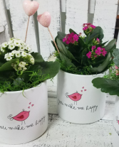 Two white ceramic pots with pink flowers and a pink bird design are placed on a white wooden surface. The pots have the phrase 'Make Me Happy' written on them. The flowers in the pots are pink and purple, and there are also some white flowers with green leaves. | You Make Me Happy! Plant | 229552cde69545b73633bc87737e9559d1802f52c936a859c0c0bcd5e095c2c5 | 000720985160 | 0 | 0 | 49 | 5 | 0 | 0 | |