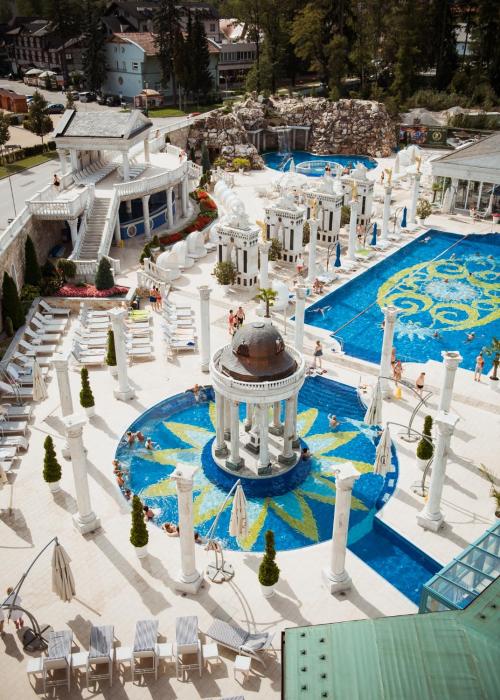 Aerial view of a luxurious resort with multiple swimming pools, surrounded by white columns and statues. The resort features a large central pool with a fountain, surrounded by sun loungers and umbrellas. There are several smaller pools scattered throughout the area, with people swimming and lounging around them. The r... | Aphrodite Palace | ac2177869a98a8f8029401d50becce503ed67be9aebc224e2a4761a6f5adb64f | 000720985132 | 0 | 0 | 66 | 2 | 0 | 0 | |