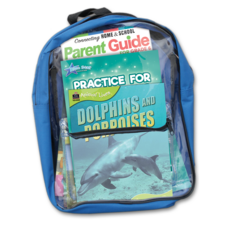 A blue backpack with a clear plastic cover is open, displaying a book titled 'Practice for Parent Guides: Dolphins and Dophinuses' inside. The book has a green and blue cover with a dolphin illustration. The backpack also contains a pencil and a ruler. | Practice for Success Level G Backpack (Grade 6) | 71515b3aabda9e918f1ea0739e11fbe2b0e98d4558aacad0981b9330355173ff | 000720932550 | 0 | 0 | 43 | 8 | 0 | 0 | |