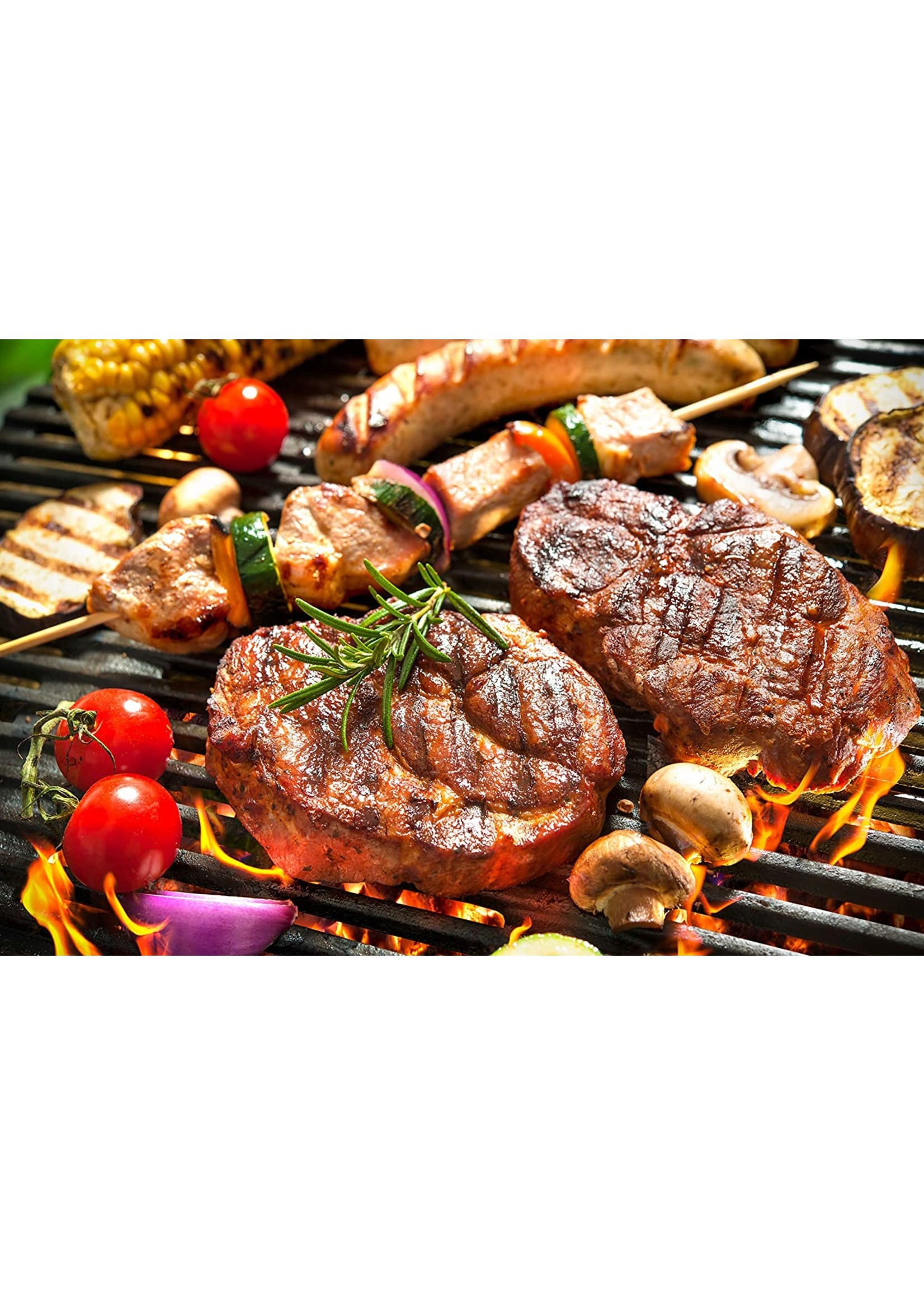 A close-up view of a barbecue grill with a variety of meats and vegetables being cooked. The grill is filled with a steak, a piece of chicken, a shrimp, and several vegetables such as tomatoes, onions, mushrooms, and bell peppers. The steak is the most prominent, with a visible grill mark pattern on its surface. The grill is emitting a bright, fiery glow, indicating high heat. | Tom Cococha Tom Cococha BBQ - Premium Grillbriketten (Kokos) 10kg | 0d5261cca2dfedc29d884f7e119b94cf8c92c1051f7bae1f776dad2b133cf408 | 000720932461 | 0 | 0 | 66 | 10 | 0 | 0 | |